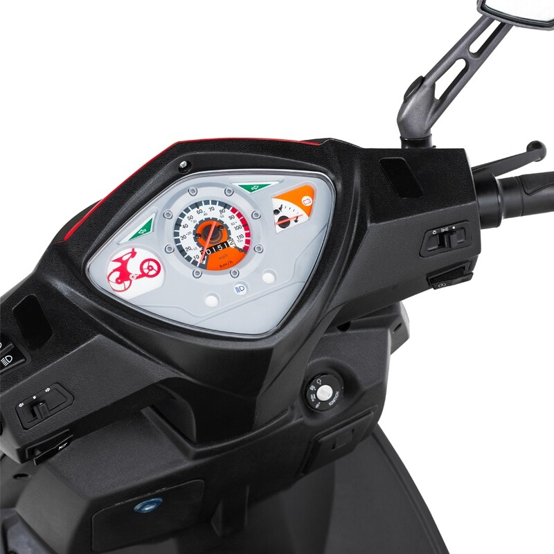 Der Roller verfügt über Scheibenbremsen vorne und hinten mit Doppelkolben, hochwertige Federung und ein großes beleuchtetes Armaturenbrett.