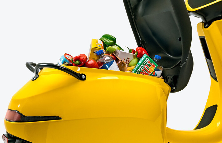 Der Roller bietet einen außergewöhnlich großen Stauraum unter dem Soziussitz. Er fasst eine komplette Bierkiste, zwei große Einkaufstaschen oder zwei Integralhelme.
