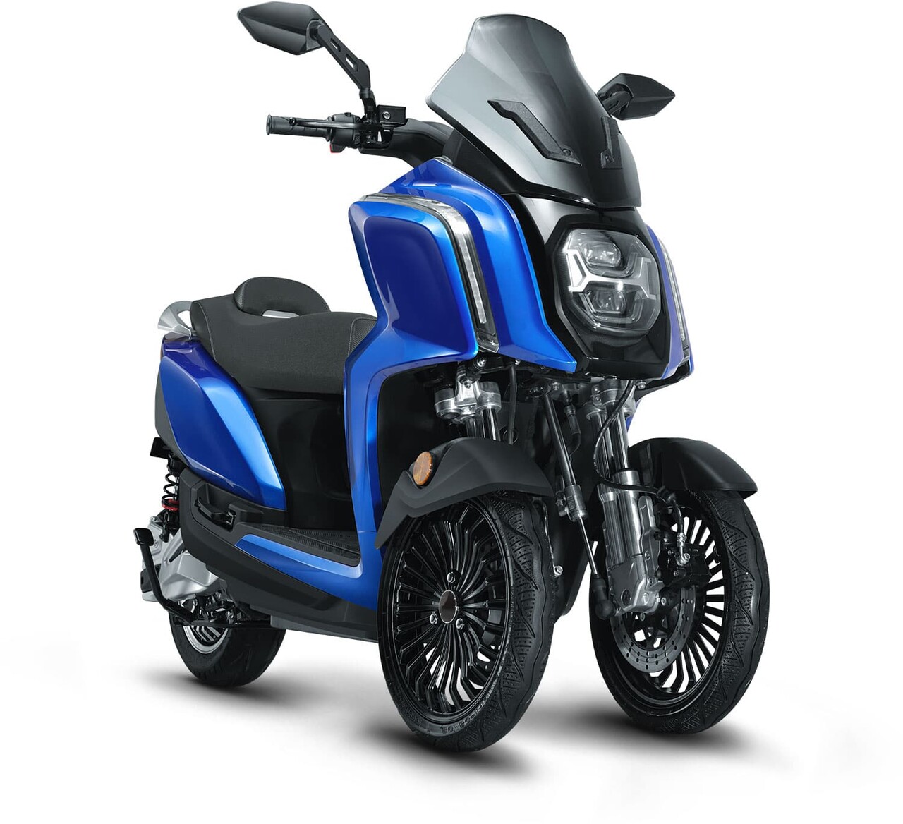 Der Roller verfügt über zwei herausnehmbare 80 Ah Lithium-Akkus für eine Reichweite von 200 km.