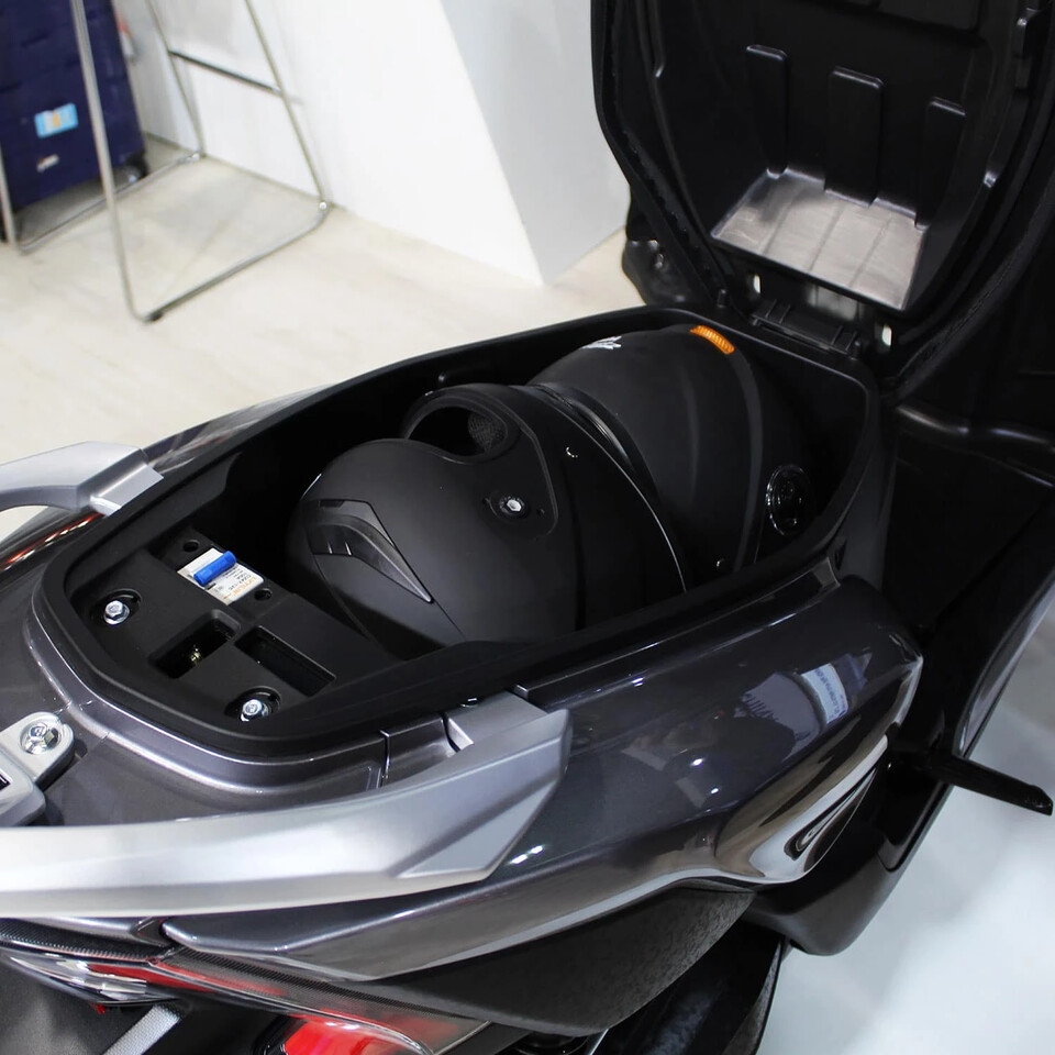 Der Roller verfügt über ein großes 36 Liter Staurabteil unter dem Sitz, in dem ein Helm Platz findet.