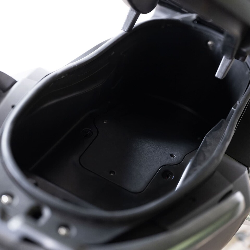 Der Roller besitzt ein großes Staufach unter dem Sitz, das einen Helm problemlos aufnehmen kann.