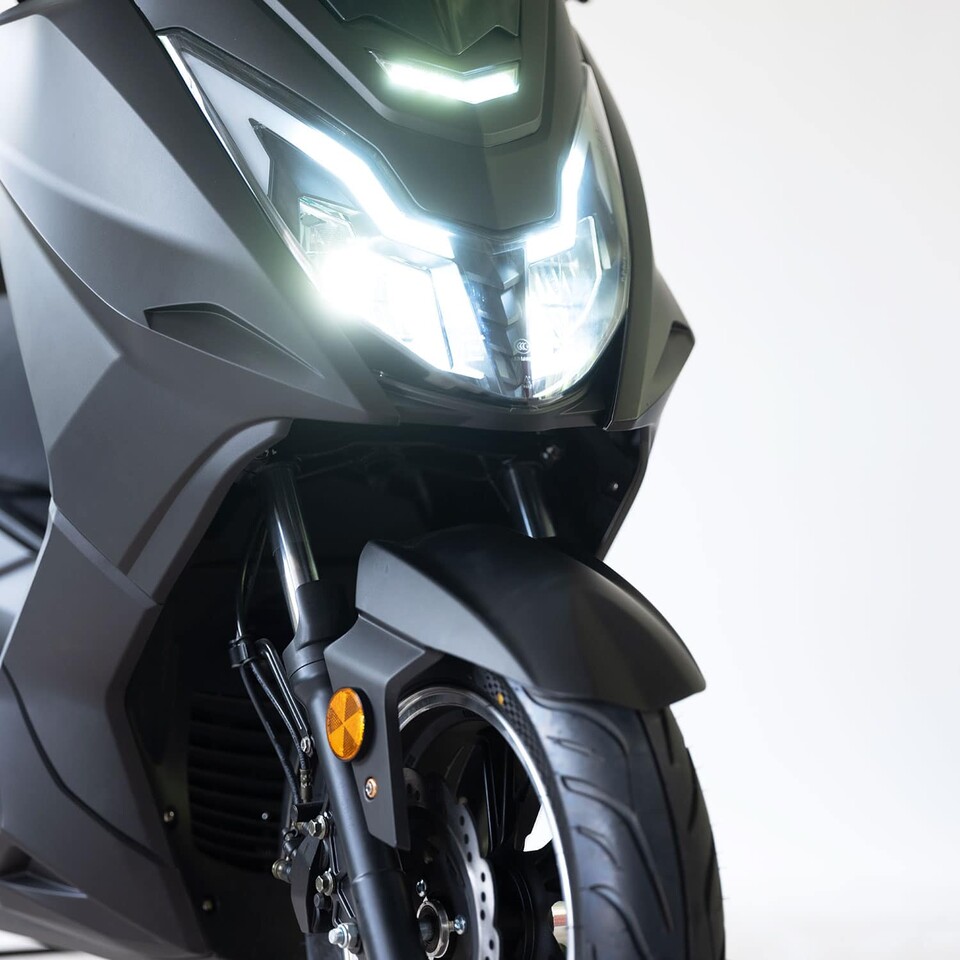 Der Roller ist mit CBS-Scheibenbremsen und Zweiklemmen-Bremssätteln ausgestattet, die eine verbesserte Bremsleistung gewährleisten.