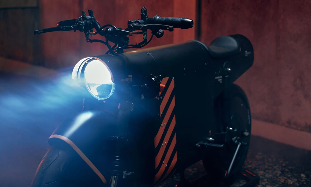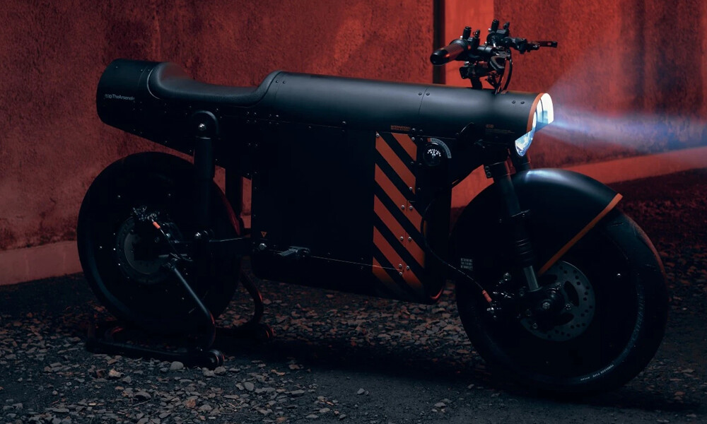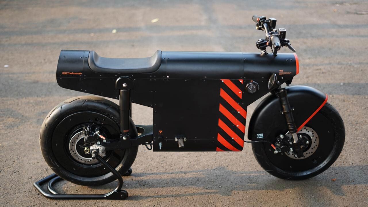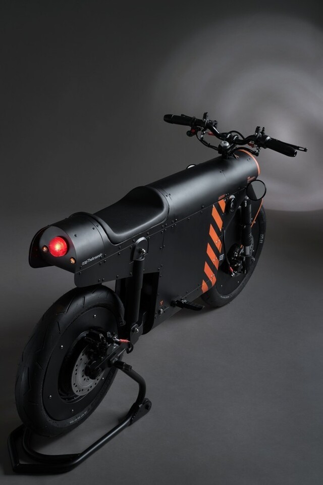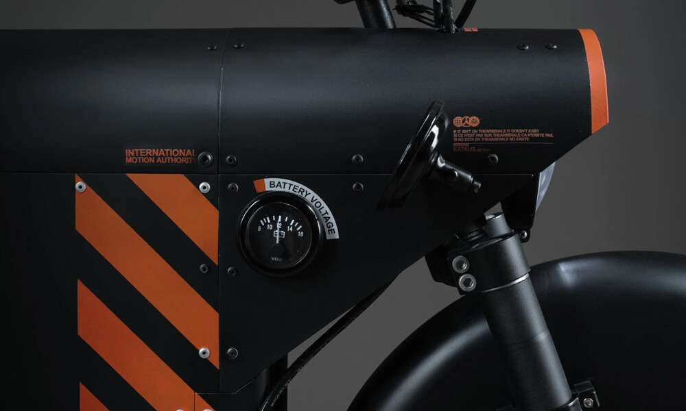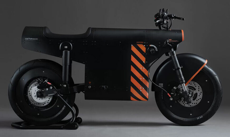 Das Design des EV-1000 - eine dominierende matte Schwarzfarbe, umwickelt mit einem orangefarbenen Streifenmuster - basiert auf der Unternehmensidentität von TheArsenale.