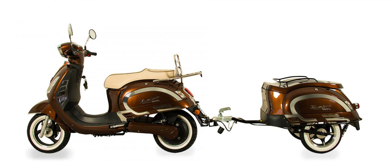 Der Roller bietet zahlreiche Zubehöroptionen, darunter einen einzigartigen Rolleranhänger im gleichen Stil und in der gleichen Farbe wie der Roller.