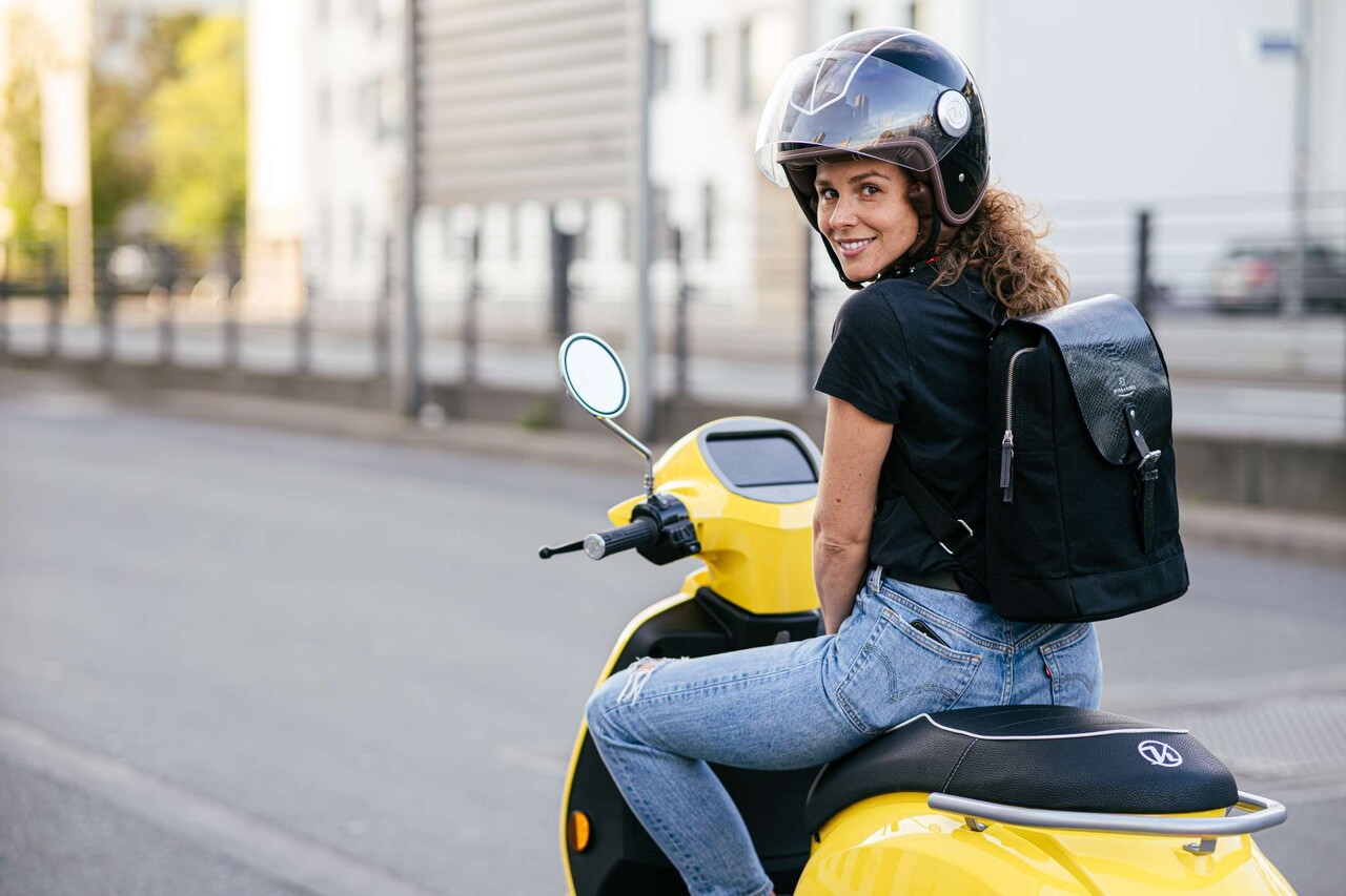 Der Roller bietet Platz für drei auswechselbare Lithium-Akkus mit einer Gesamtfahrstrecke von 120 km (40 km pro Akku).