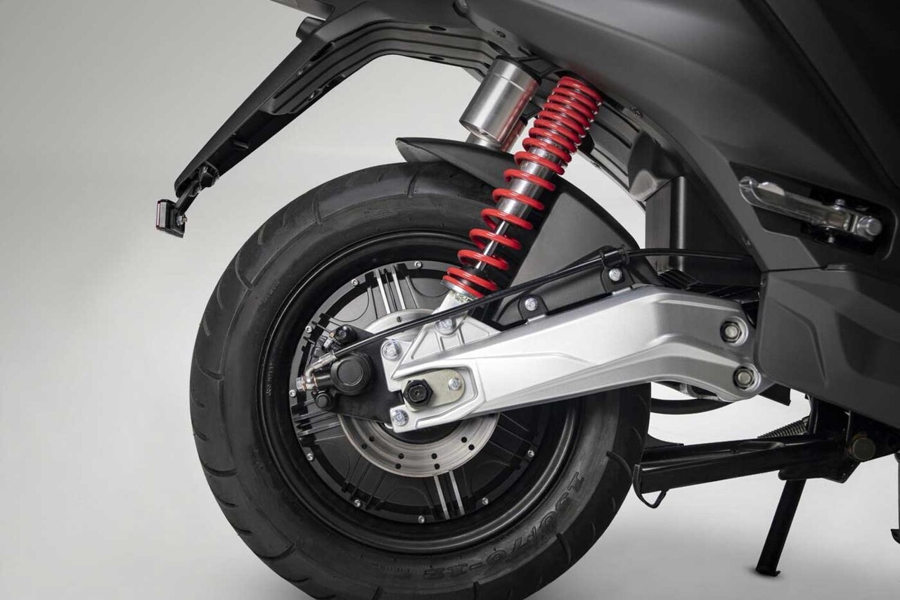 Die 1900W-Version hat leistungsstarke Scheibenbremsen mit 2-Kolben-Bremssattel, 210 mm Ø vorne und 170 mm Ø hinten. Der Roller ist mit Zweifach-Gasdruckstoßdämpfern hinten ausgestattet.