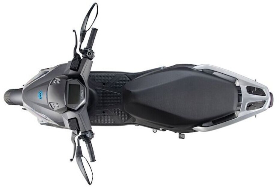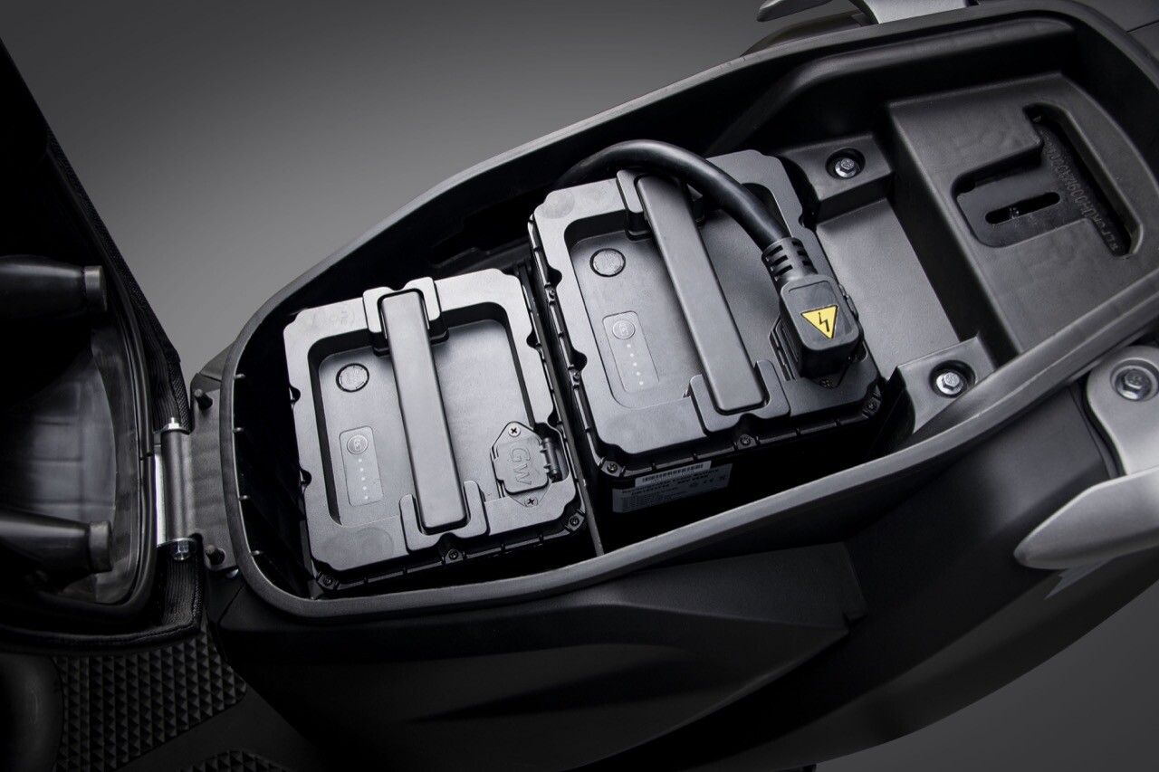 Der Roller verfügt über zwei herausnehmbare 26 Ah Lithium-Akkus von LG für eine Reichweite von 160 km.
