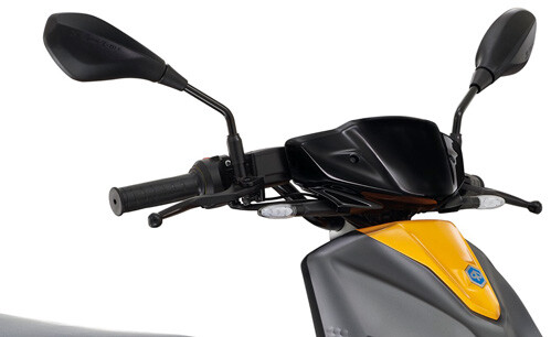 Der Roller verfรผgt รผber einen herausnehmbaren 48 Ah Lithium-Akku fรผr eine Reichweite von 100 km.