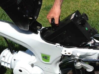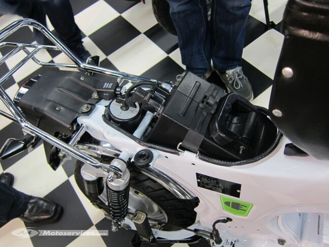 Das Mofa hat einen austauschbaren Lithium-Akku mit einer Reichweite von 70 km. Zusätzlich kann ein weiterer Akku eingebaut werden, wodurch sich die Gesamtreichweite auf 70 km (70 km insgesamt) erhöht.