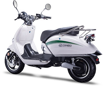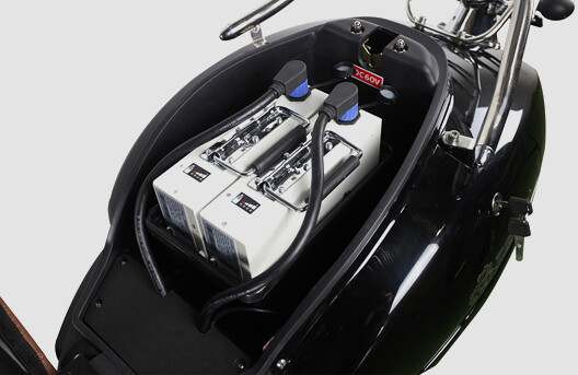 Der Roller verfügt über drei herausnehmbare Lithium-Akkus mit einer Reichweite von 150 km. Die Batterien sind von hoher Qualität und entsprechen dem Batterietyp des Tesla Model S.