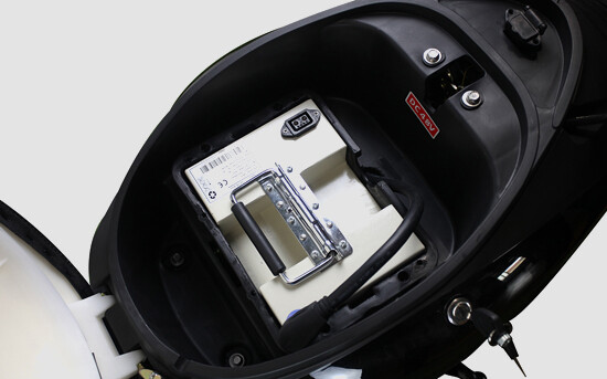 Der Roller besitzt einen herausnehmbaren Lithium-Akku mit einer Reichweite von 60 km. Der Akku ist von hoher Qualität und entspricht dem Batterietyp des Tesla Model S.