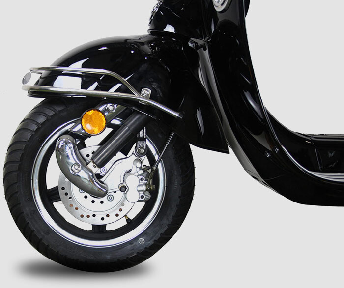Der Roller hat Scheibenbremsen vorne und hinten.