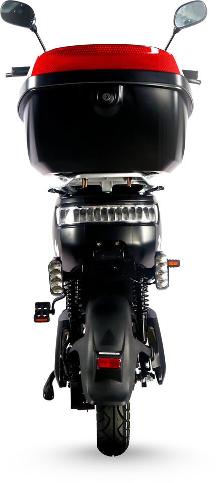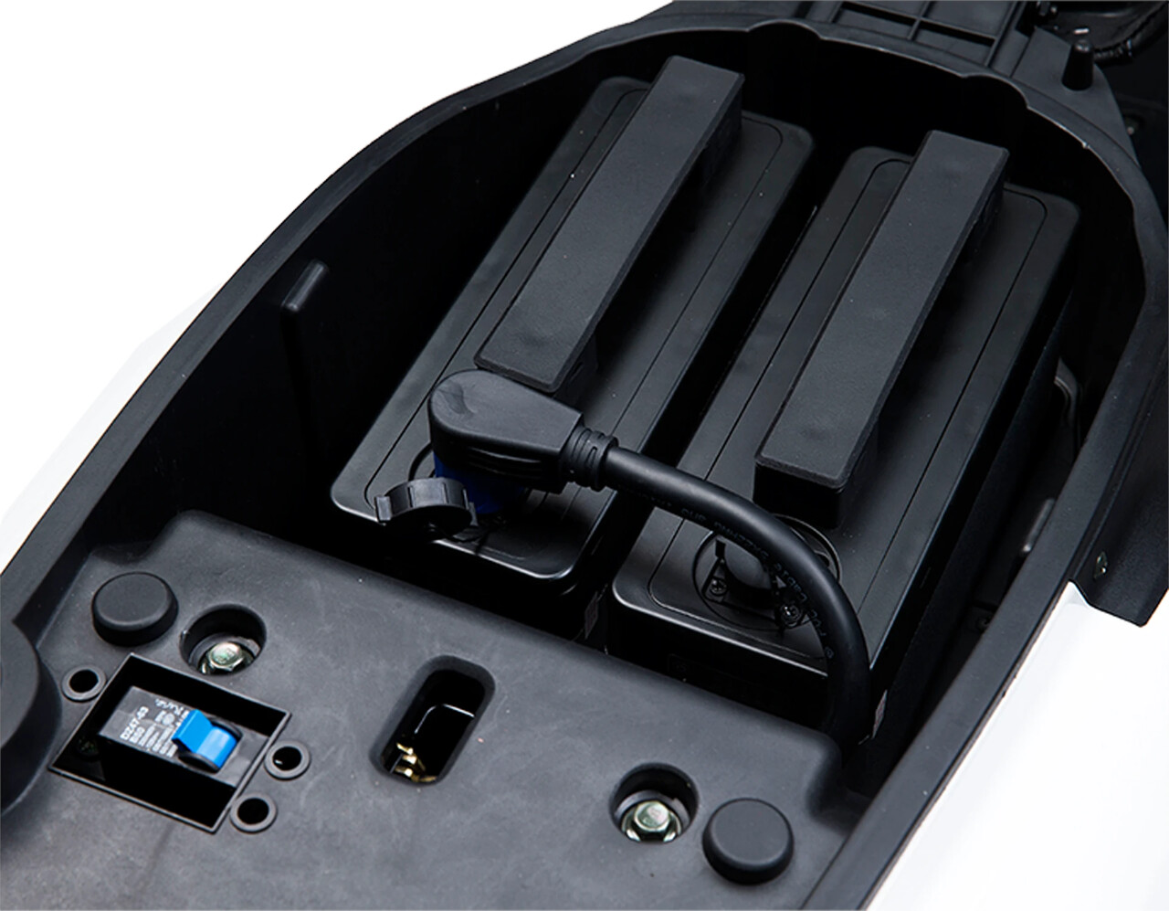 Der Roller verfügt über einen herausnehmbaren Lithium-Akku, der eine Reichweite von 97 km ermöglicht. Der Roller bietet Platz für zwei Batterien.